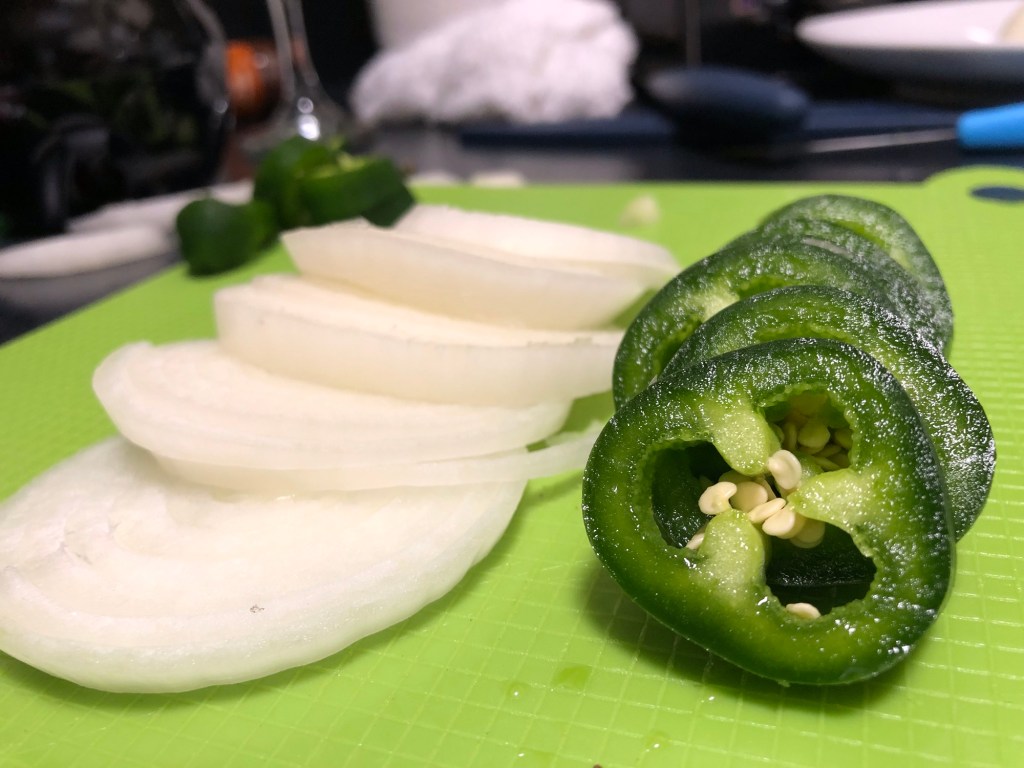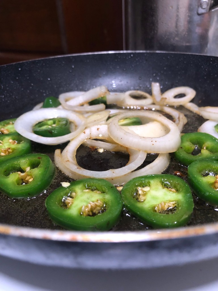 - In a separate skillet, sizzle the remaining portion of finely diced onions and jalapeno slices until golden and caramelized.