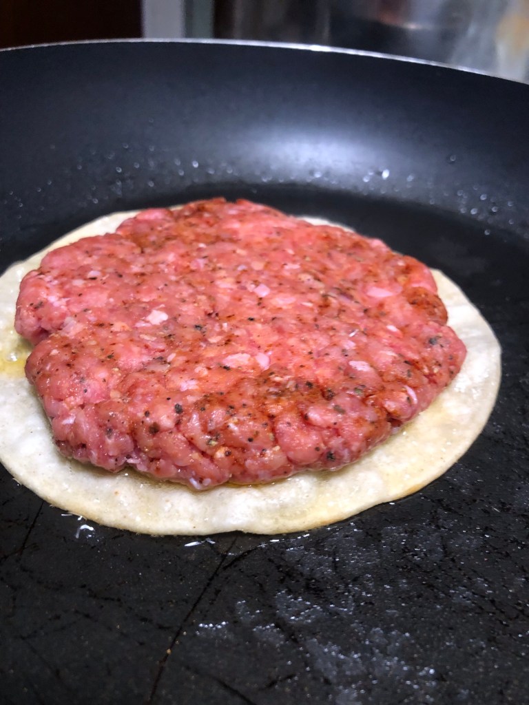 - Once the tortillas are fried, place a cheese-topped beef patty on each tortilla.
