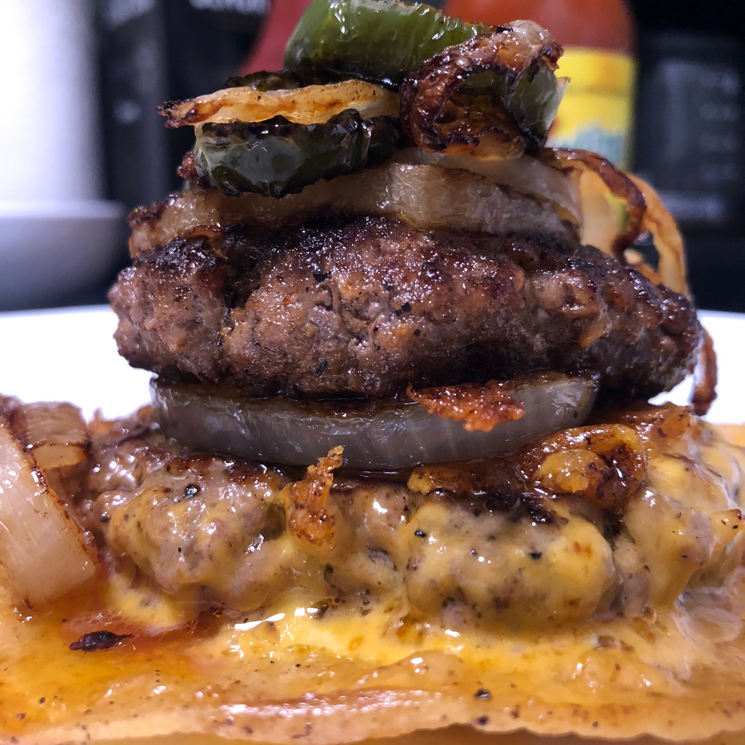 - Top each burger with the caramelized onions and jalapenos.