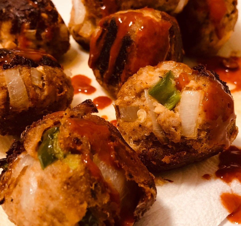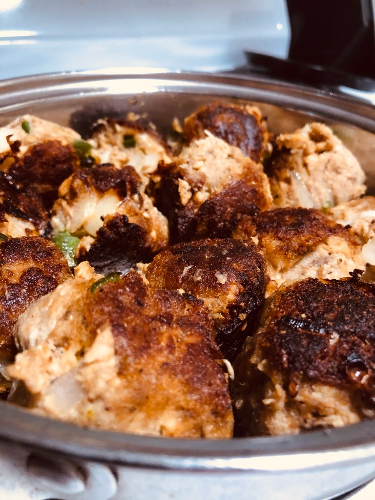 I rolled my Salmon into BALLS, OKAY!? And…added jalapeños, and onion. I subbed egg for a splash of milk, and instead of saltines. I used bread crumbs and a dash of flour—plenty of salt and pepper. Personally, I would have used Saltines and Egg—vs—Bread Crumbs+Flour and Milk—1) the saltines add necessary saltiness2) they combine the crunch of bread crumbs, and the binding properties of flour 3) and lastly, it’s such a novel thing to crunch up saltines.