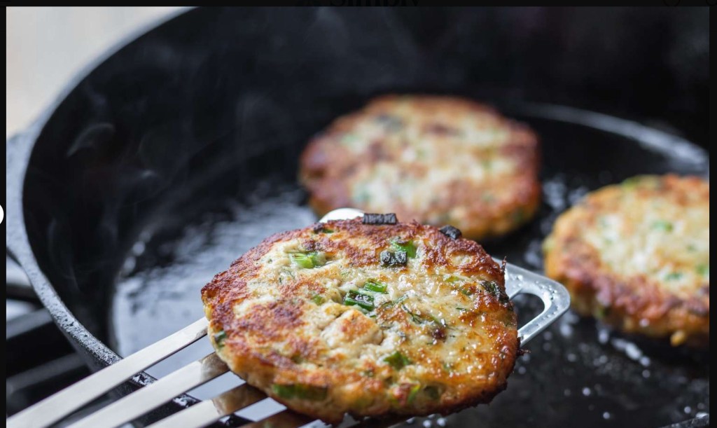 Growing up, my Aunt, who raised me, would make us her special Salmon Patties. Hers looked very similar to the ones pictured below(including the cast iron pan).