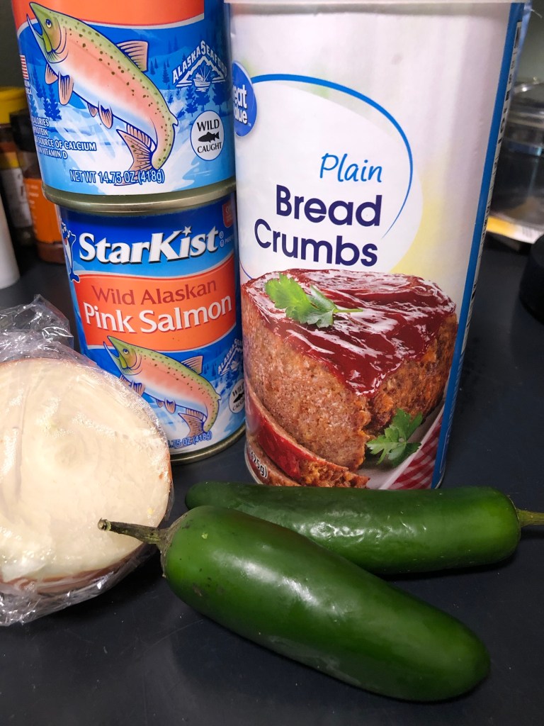 My aunt would mix together the necessary ingredients—eggs, saltines, salt, pepper, salmon—nothing more, nothing less. Simple, tasty, and quite healthy. Her’s didn’t feature the little green flecks seen below haha. It would also feature a “hunka’ onion”, and a glass of whole milk.