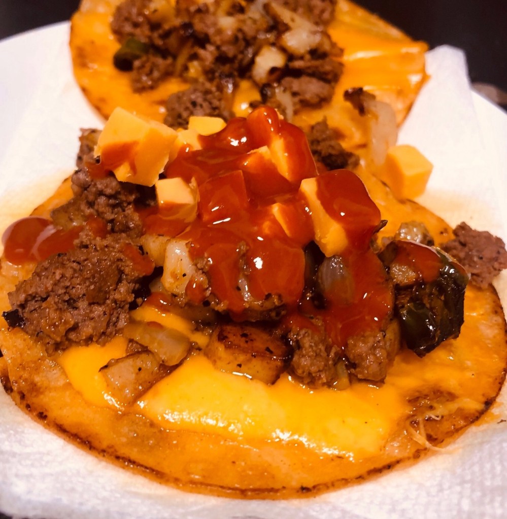 5. Assemble the Tostadas: To assemble, spread a layer of the cooked ground beef mixture onto each crispy corn tortilla shell. Top with a generous amount of diced fried potatoes.