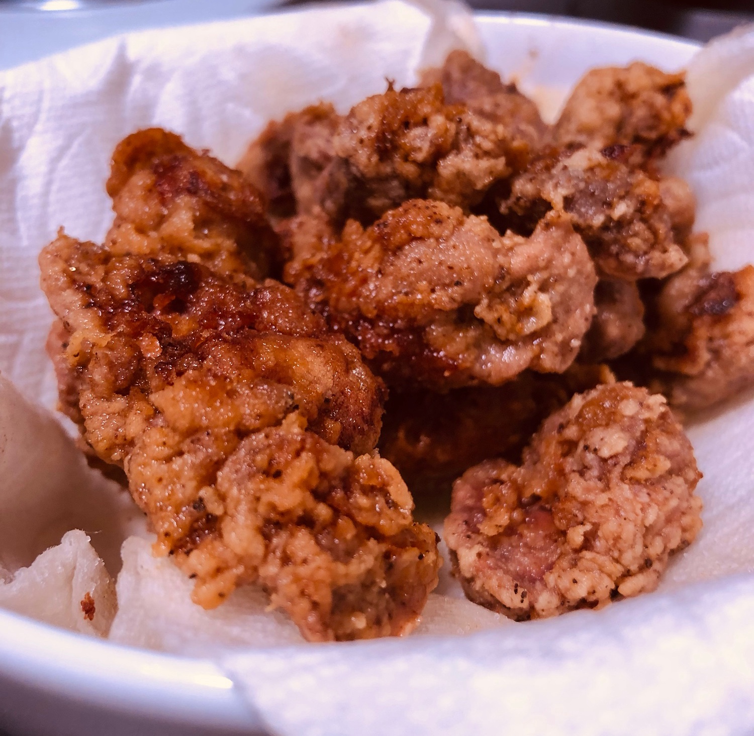 The Gizzards of a Chicken is a more common menu item, than the Heart. The Gizzard is also much more difficult to eat, in my opinion. Very chewy—and rubbery—all the more reason to fry them a minute or two longer.