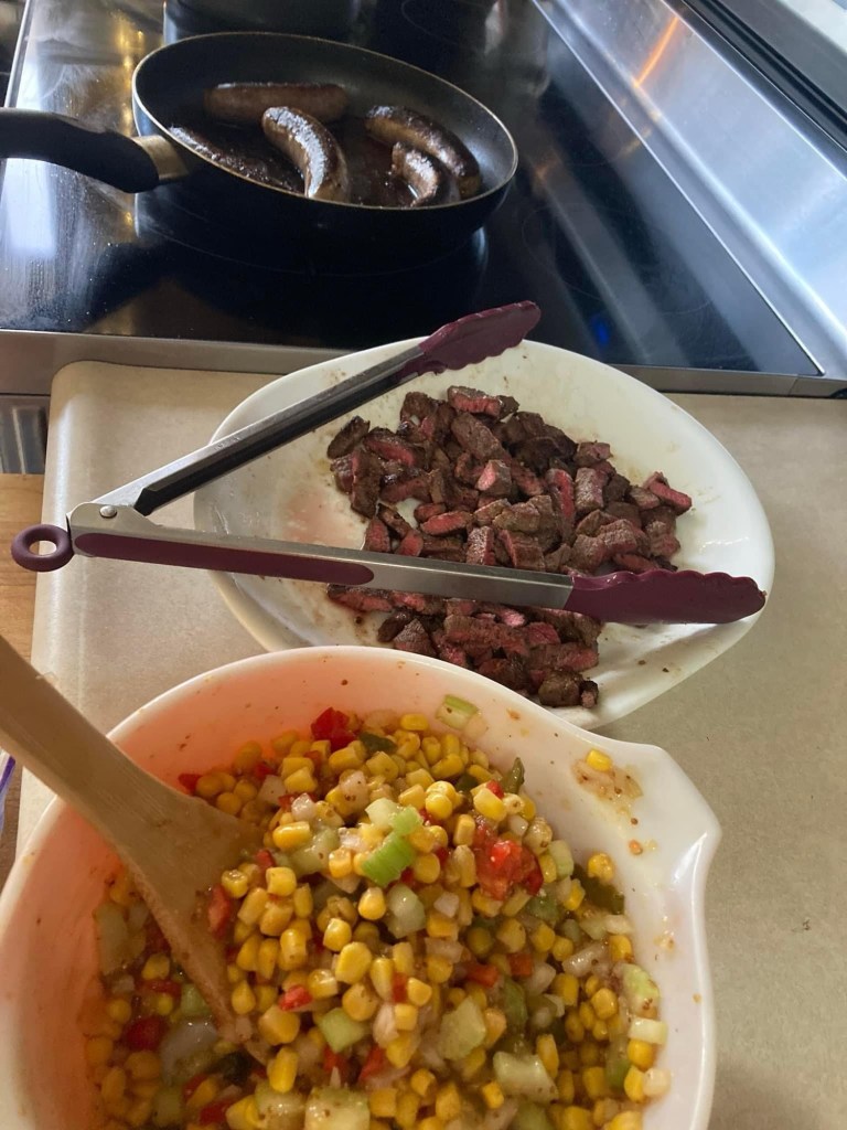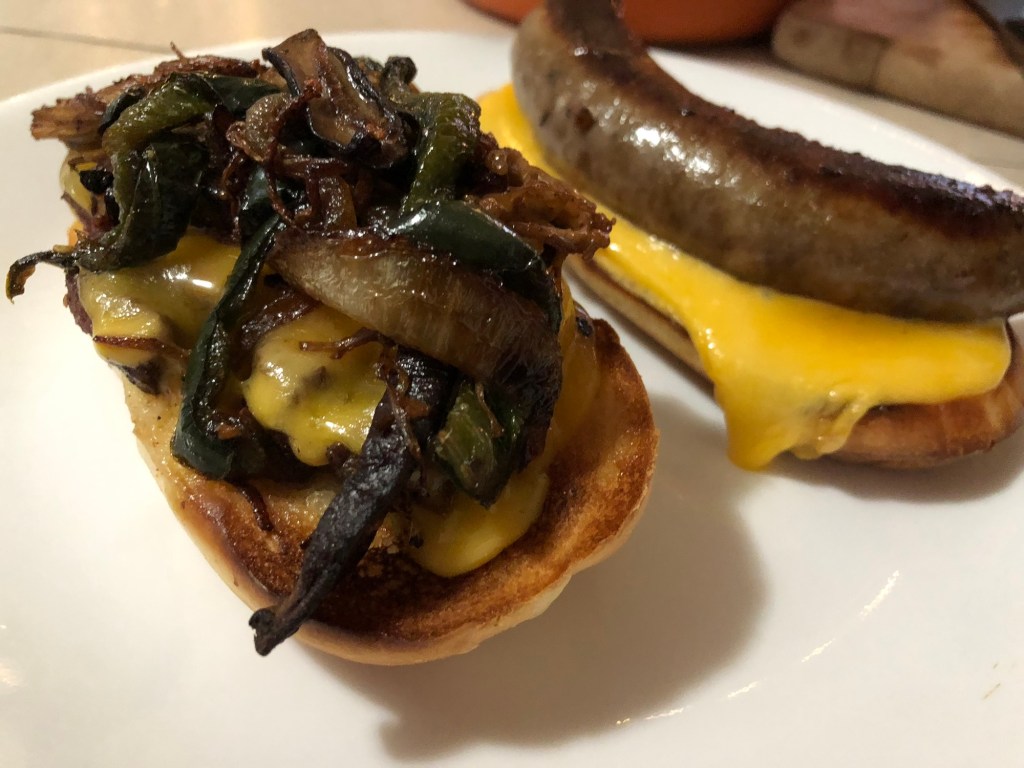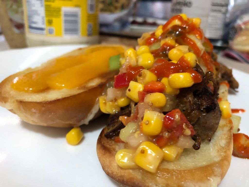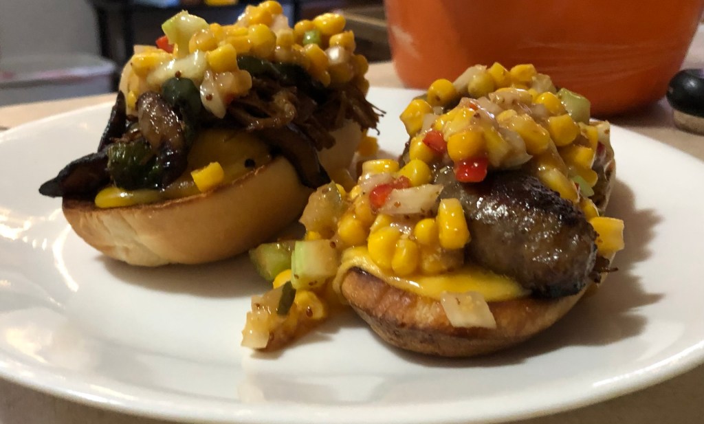 No less than toasted buns, fried mushrooms, onions, & peppers AND a fresh old fashioned corn salad—I present to you—my personal bite. I chose a bratwurst—over steak—I don’t know what got into me. Who knows when the next time a steak sandwich will just be offered to me, Willy-Nilly. Shucks.