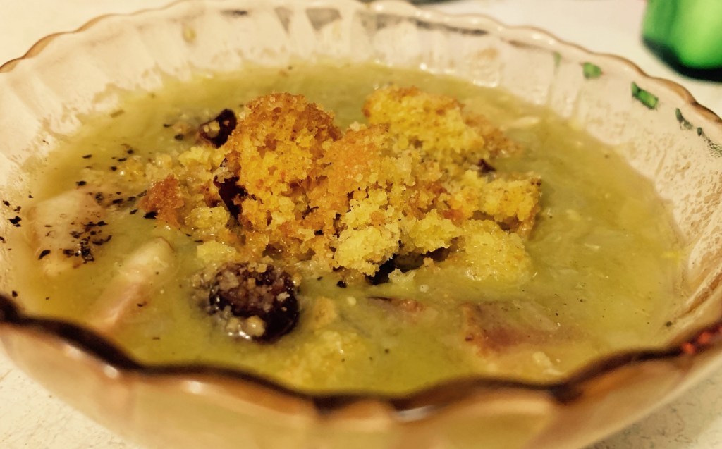 This split pea was a completely separate mealâI couldnât tell you how it was made, but I can tell you it had thick chunks of Bacon, and was topped with delightful Corn Bread crumble.