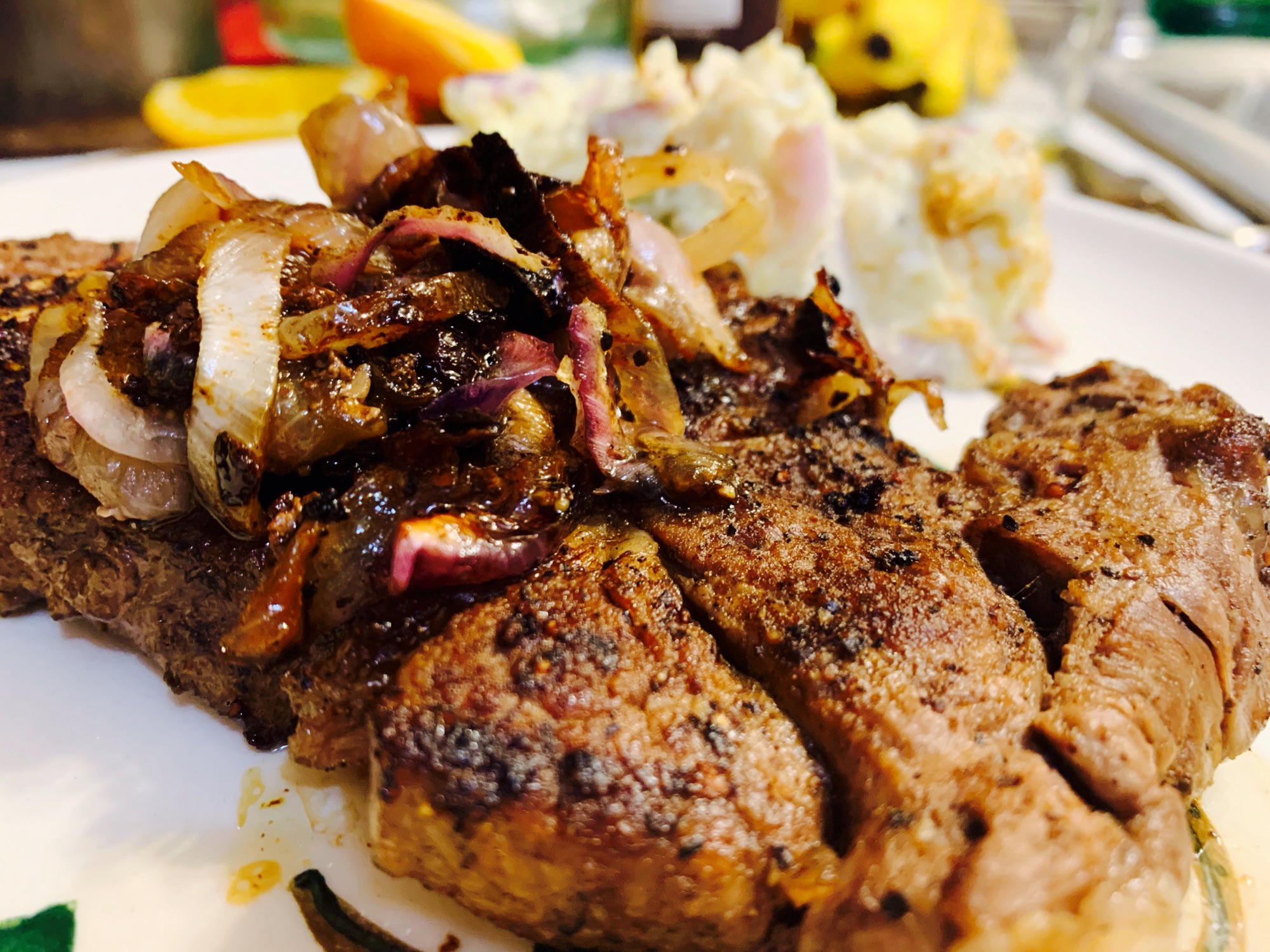 My Pa and I were playing video games, as usssh, and I went to take a bath. Flash forward two hours, and delicious steaks awaited me. ‘tater salad fixin’s were prepared and served to me on a platter.
