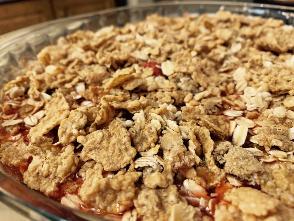 Pour the strawberry mixture into a greased 9×13-inch baking dish. Sprinkle the topping mixture evenly over the strawberries. Drizzle the melted butter over the topping. - Bake: