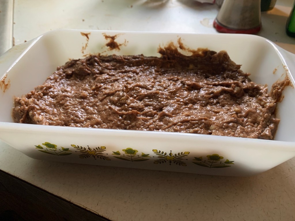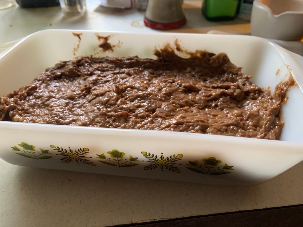 - Pour the batter into the prepared loaf pan.