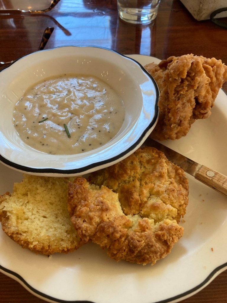 Donât ask me what my sister ordered; I think a chicken & biscuit with gravy. Well, the gravy SLAPPEDâas the kids would say. Idk about the biscuit or the chicken..,.