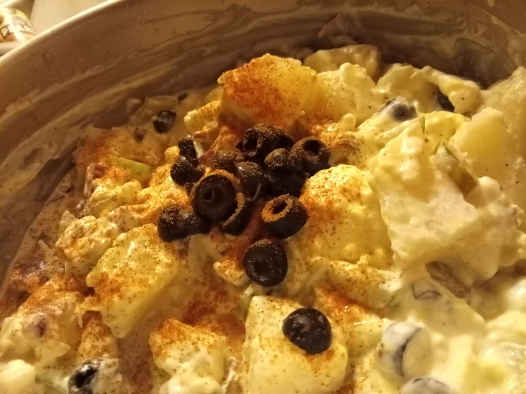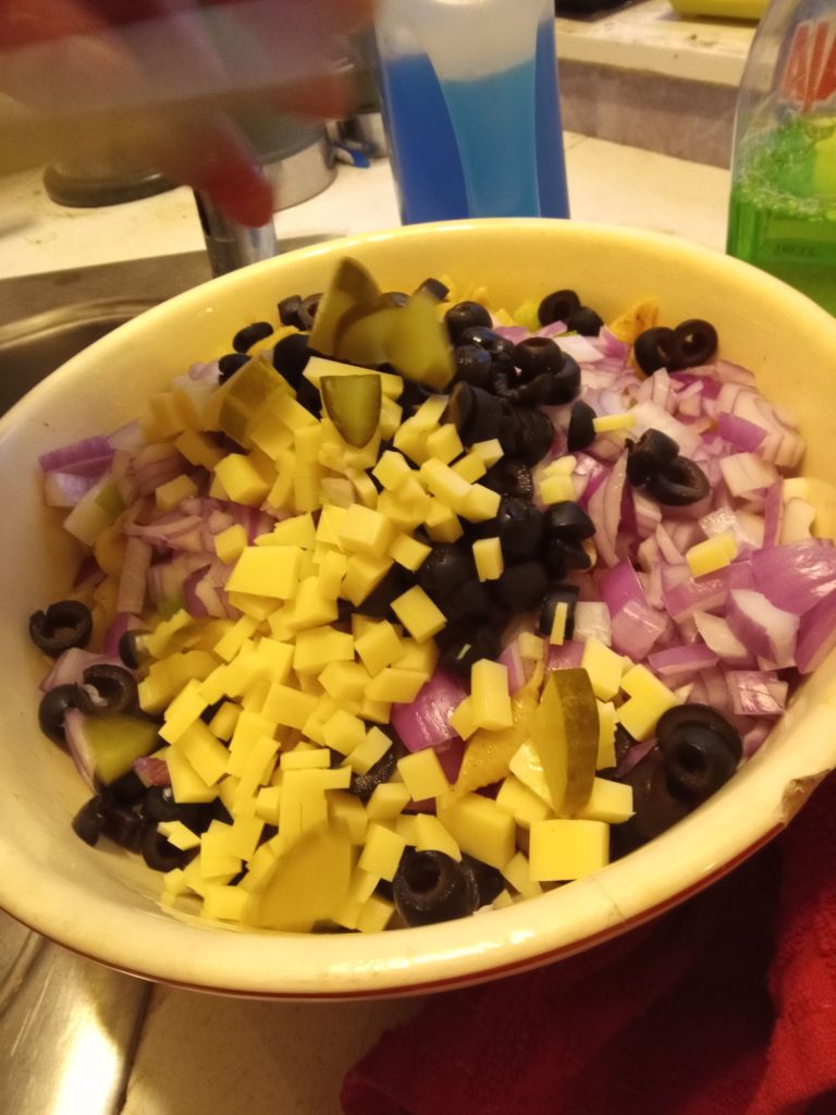 We added Onions and Olives to the salad, and it turned out amazing. And you can’t forget the pickles and juice!