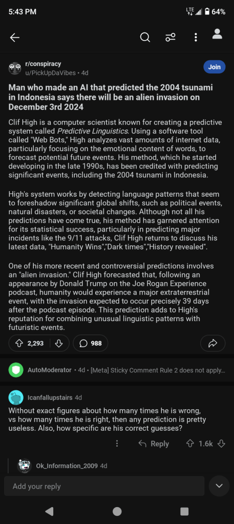 Today is a pretty cool episode. I was surfing through Reddit and just minding my own business, when I stumbled upon: “PREDICTION OF ALIEN INVASION” December 3rd, 2024.